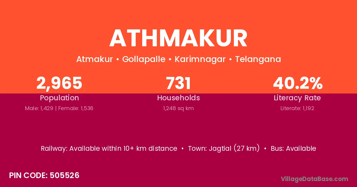 Jagtial (27 km) is the nearest town to Athmakur village for major economic activities and is located approximately 27 km away.