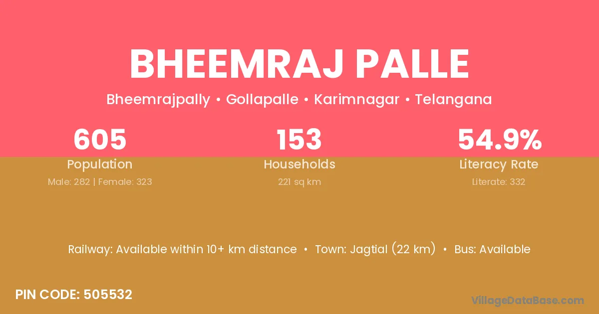 Jagtial (22 km) is the nearest town to Bheemraj Palle village for major economic activities and is located approximately 22 km away.