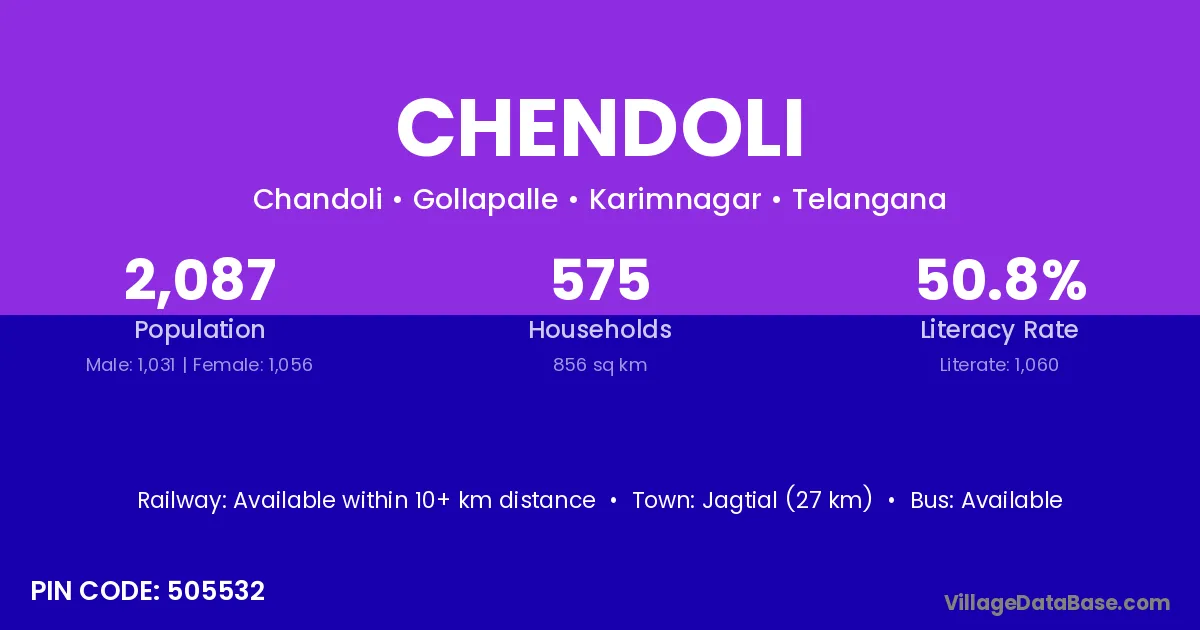 Jagtial (27 km) is the nearest town to Chendoli village for major economic activities and is located approximately 27 km away.