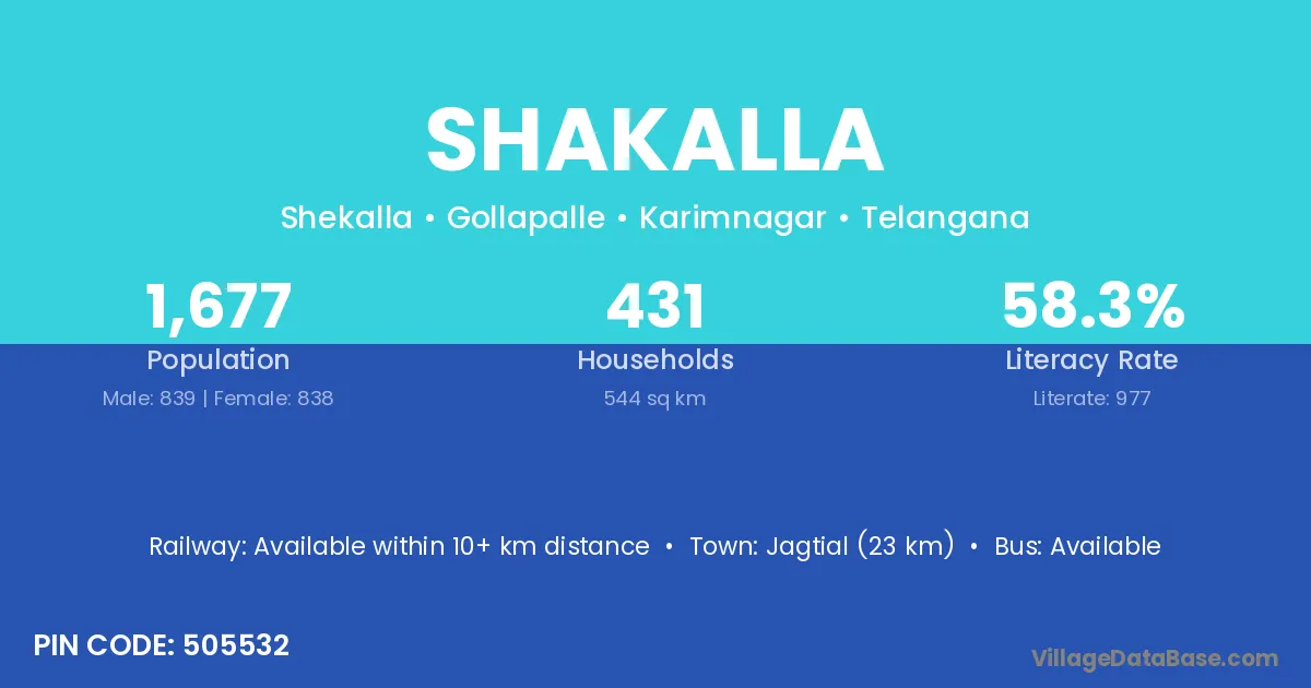 Jagtial (23 km) is the nearest town to Shakalla village for major economic activities and is located approximately 23 km away.