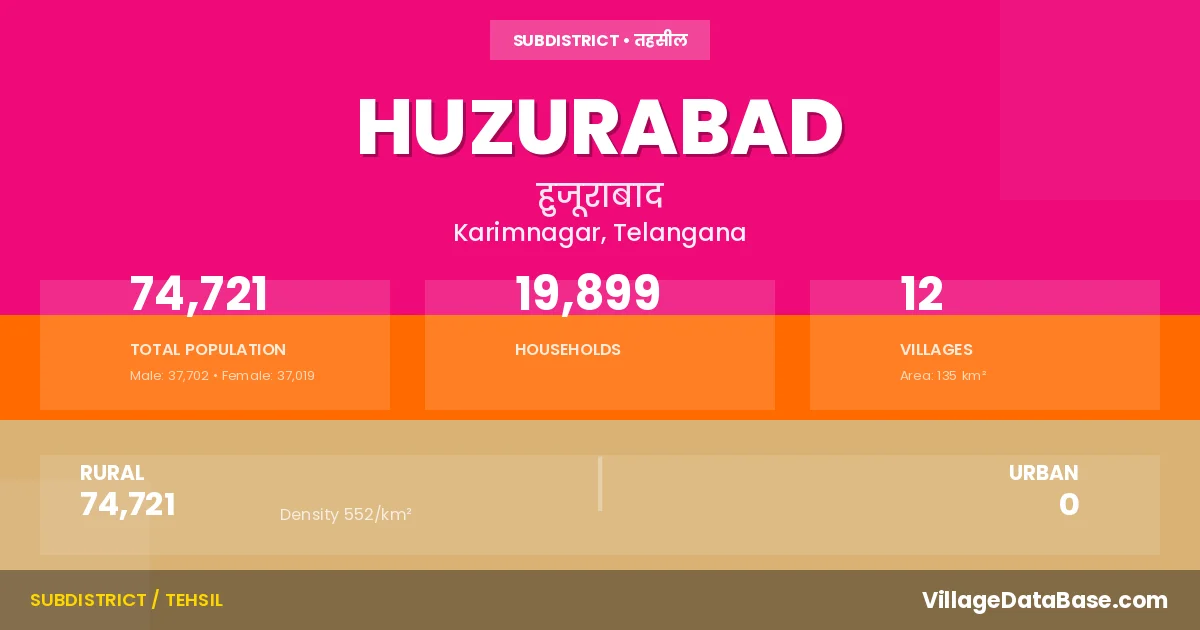 According to the 2011 census The total area of Huzurabad Mandal is 135 km², with a population of 74721 people. The population density is 552 inhabitants per square kilometre, and there are approximately 19899 houses in the sub district.
