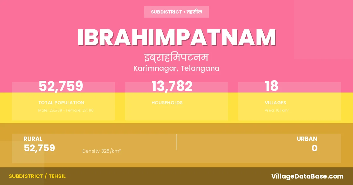 According to the 2011 census The total area of Ibrahimpatnam Mandal is 161 km², with a population of 52759 people. The population density is 328 inhabitants per square kilometre, and there are approximately 13782 houses in the sub district.