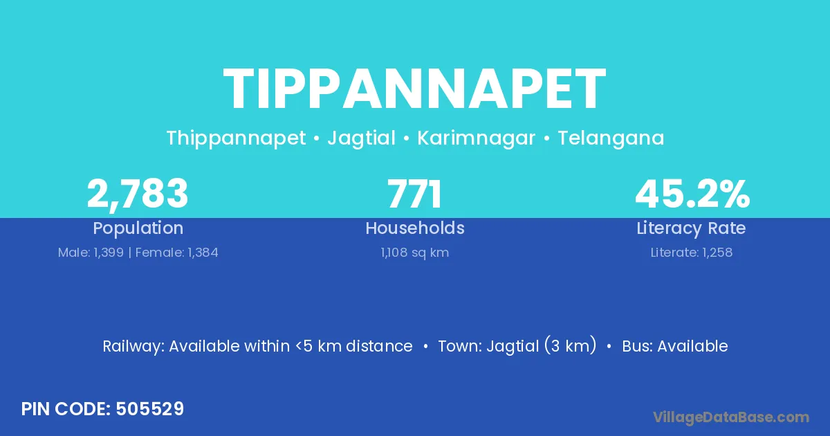 Jagtial (3 km) is the nearest town to Tippannapet village for major economic activities and is located approximately 3 km away.