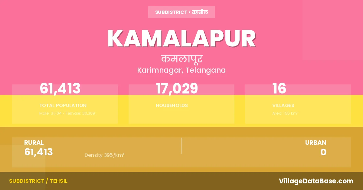 According to the 2011 census The total area of Kamalapur Mandal is 155 km², with a population of 61413 people. The population density is 395 inhabitants per square kilometre, and there are approximately 17029 houses in the sub district.