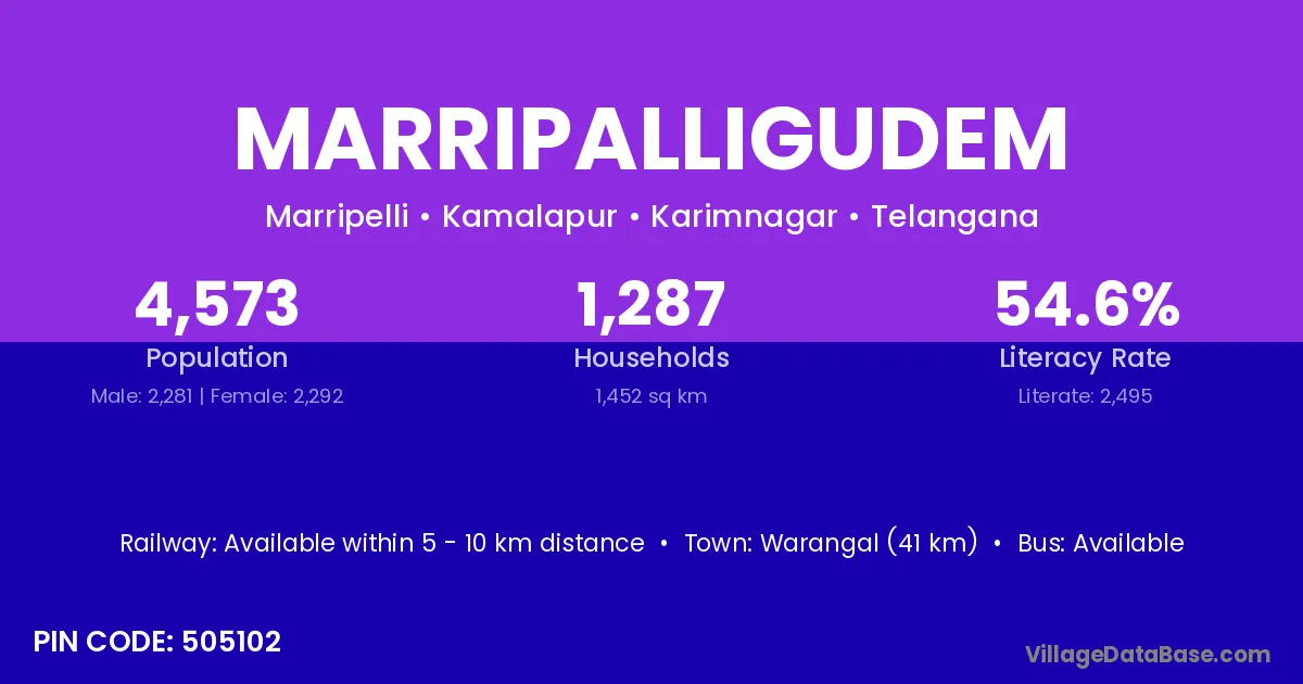 Marripalligudem village has a total population of 4,573 people, of which 2,281 are males and 2,292 are females.