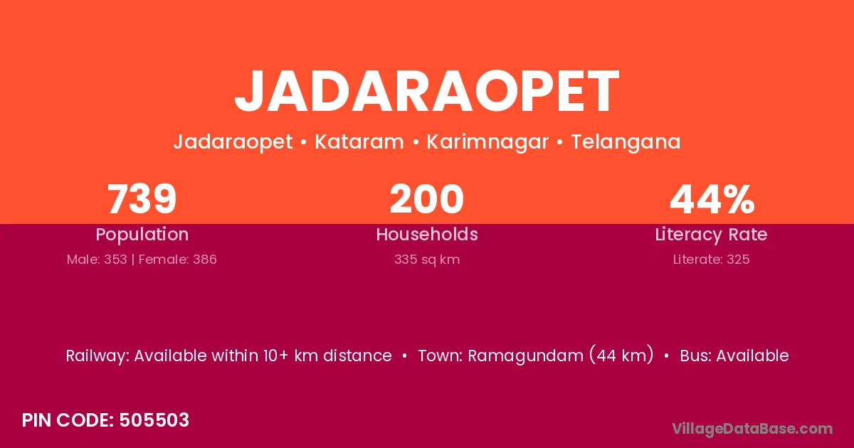 Ramagundam (44 km) is the nearest town to Jadaraopet village for major economic activities and is located approximately 44 km away.