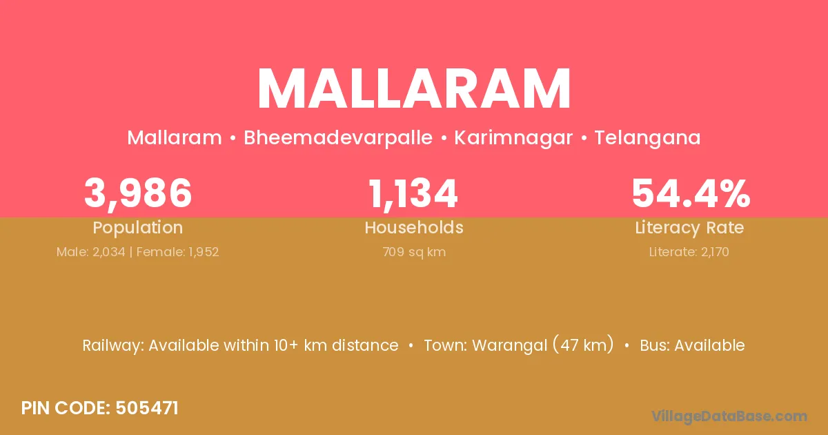 Ramagundam (55 km) is the nearest town to Mallaram village for major economic activities and is located approximately 55 km away.