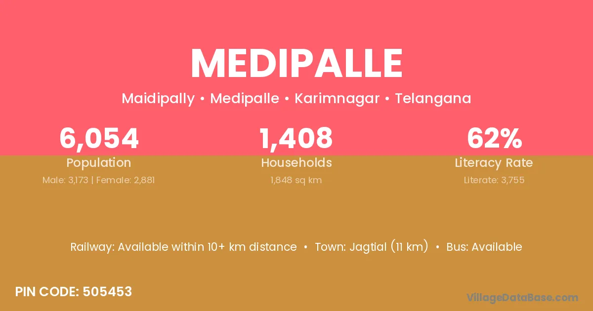 Ramagundam (45 km) is the nearest town to Medipalle village for major economic activities and is located approximately 45 km away.