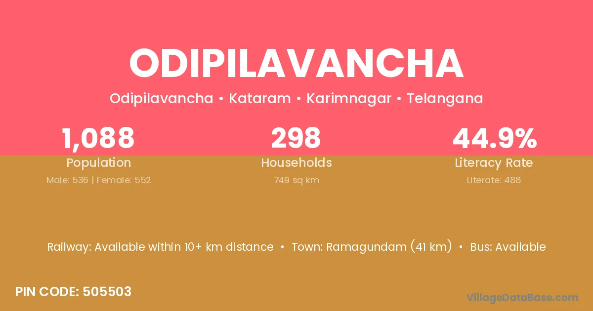 Ramagundam (41 km) is the nearest town to Odipilavancha village for major economic activities and is located approximately 41 km away.