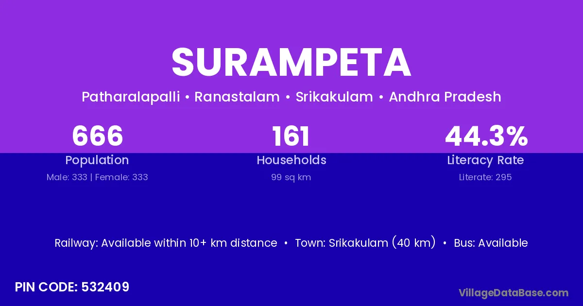 The literacy rate of Surampeta village is 48.15%. Male literacy stands at 56.46% and female literacy at 40.00%.