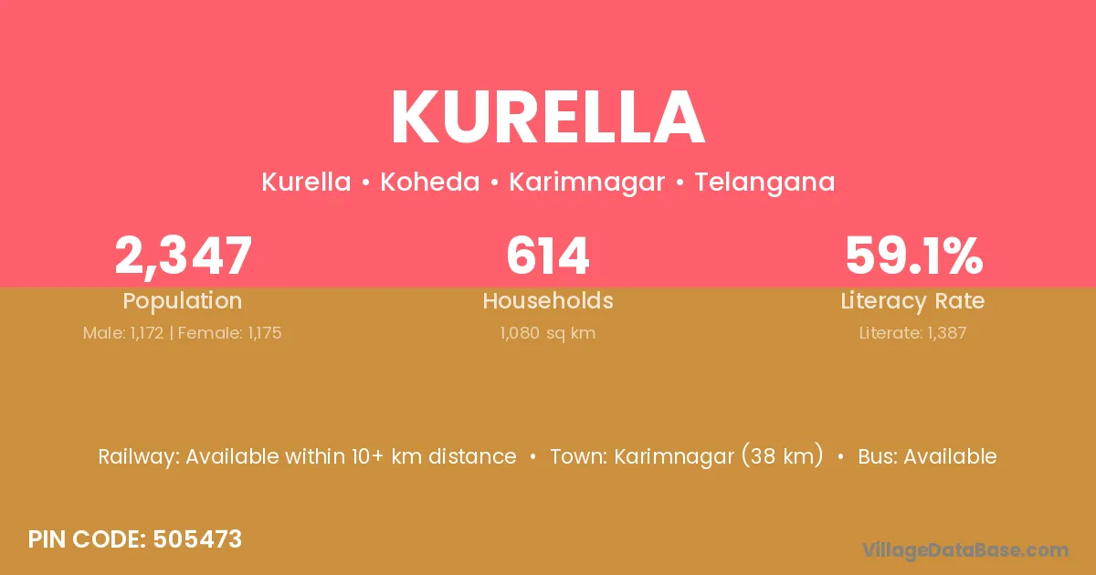 Karimnagar (38 km) is the nearest town to Kurella village for major economic activities and is located approximately 38 km away.