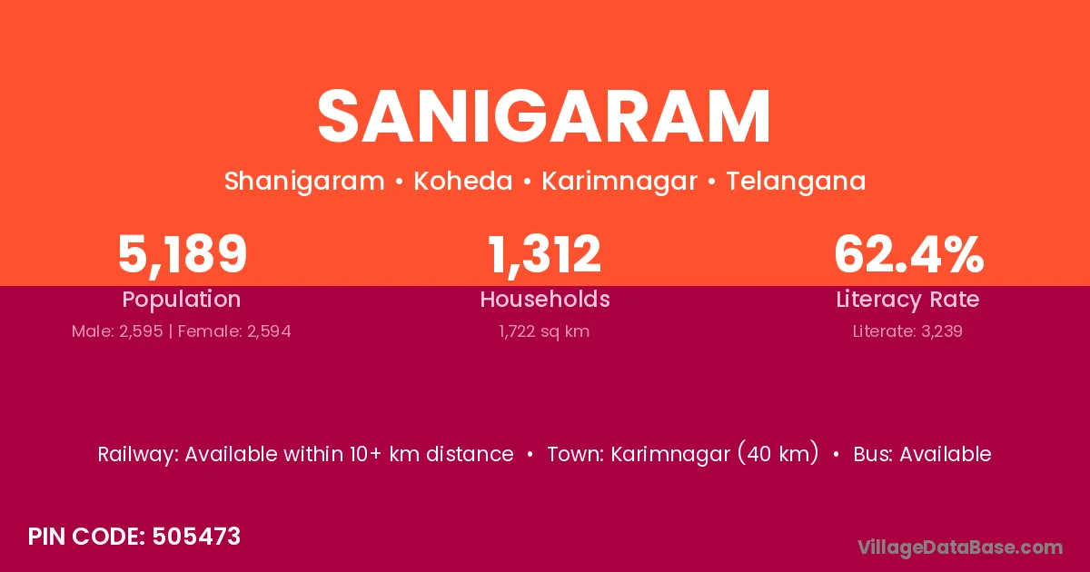 Karimnagar (40 km) is the nearest town to Sanigaram village for major economic activities and is located approximately 40 km away.