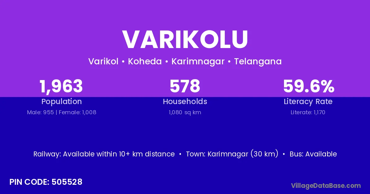 Karimnagar (30 km) is the nearest town to Varikolu village for major economic activities and is located approximately 30 km away.