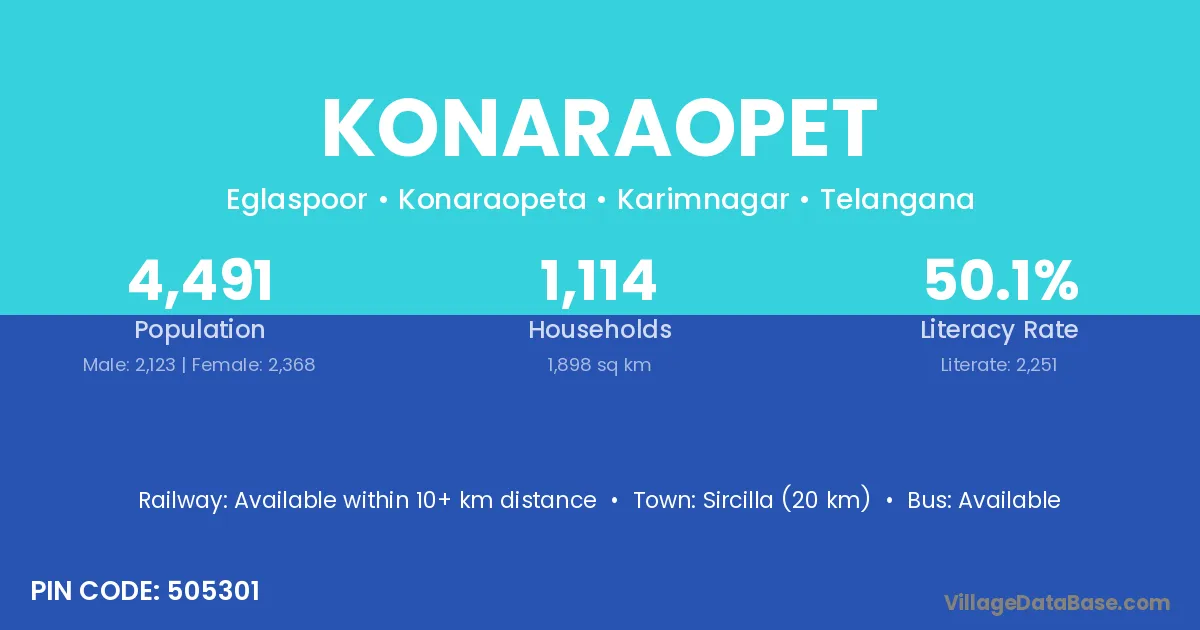 Sircilla (20 km) is the nearest town to Konaraopet village for major economic activities and is located approximately 20 km away.