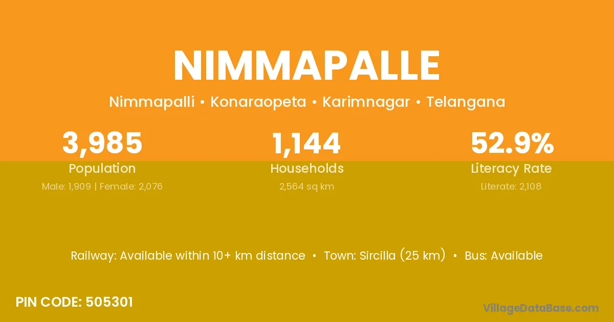 Sircilla (25 km) is the nearest town to Nimmapalle village for major economic activities and is located approximately 25 km away.