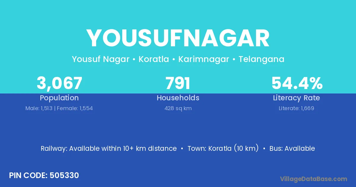 Koratla (10 km) is the nearest town to Yousufnagar village for major economic activities and is located approximately 10 km away.
