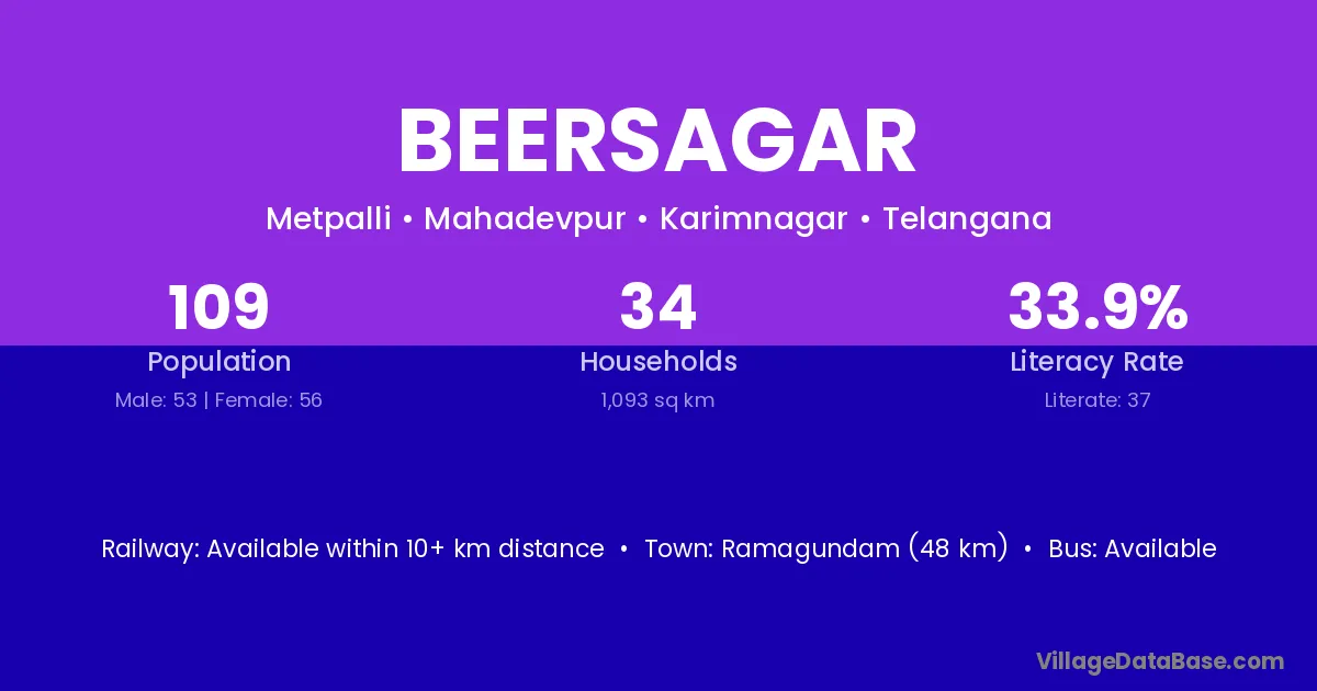 Ramagundam (48 km) is the nearest town to Beersagar village for major economic activities and is located approximately 48 km away.