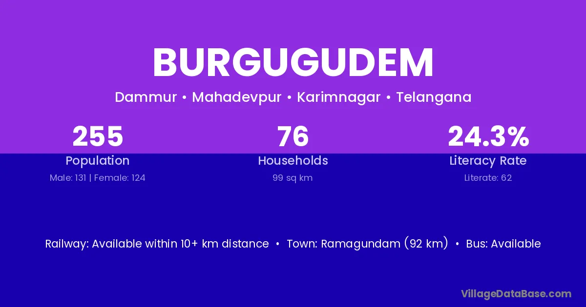 Ramagundam (92 km) is the nearest town to Burgugudem village for major economic activities and is located approximately 92 km away.