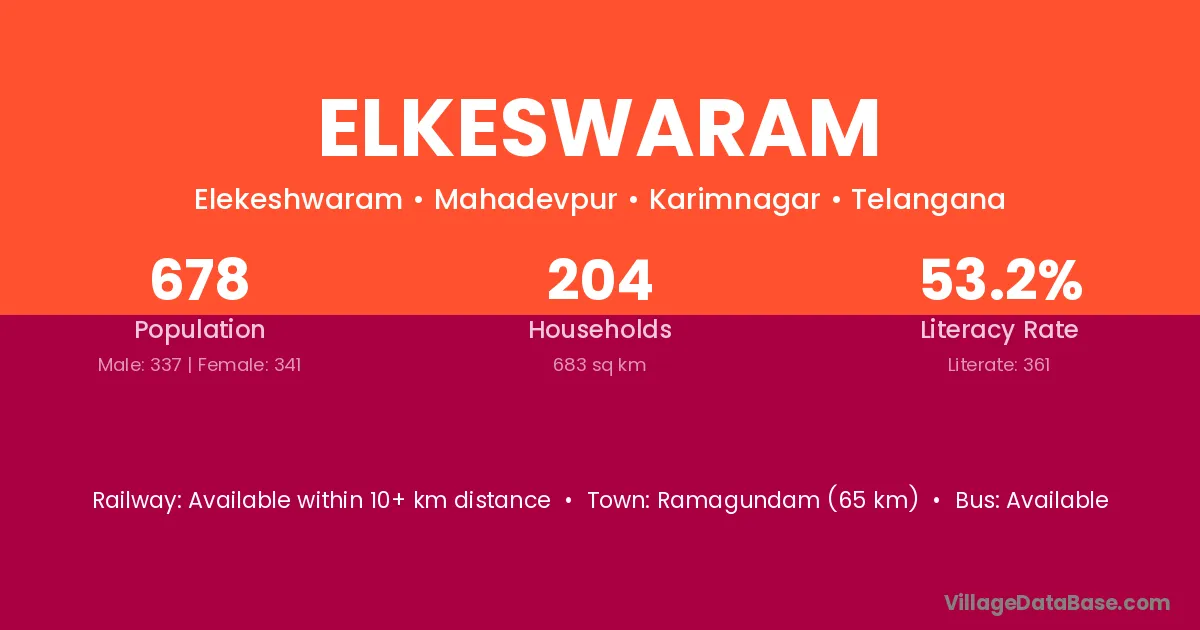 Ramagundam (65 km) is the nearest town to Elkeswaram village for major economic activities and is located approximately 65 km away.
