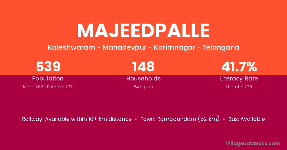 Ramagundam (52 km) is the nearest town to Majeedpalle village for major economic activities and is located approximately 52 km away.