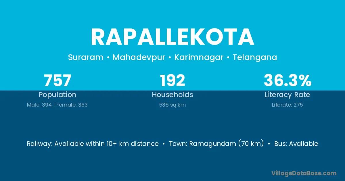 Ramagundam (70 km) is the nearest town to Rapallekota village for major economic activities and is located approximately 70 km away.