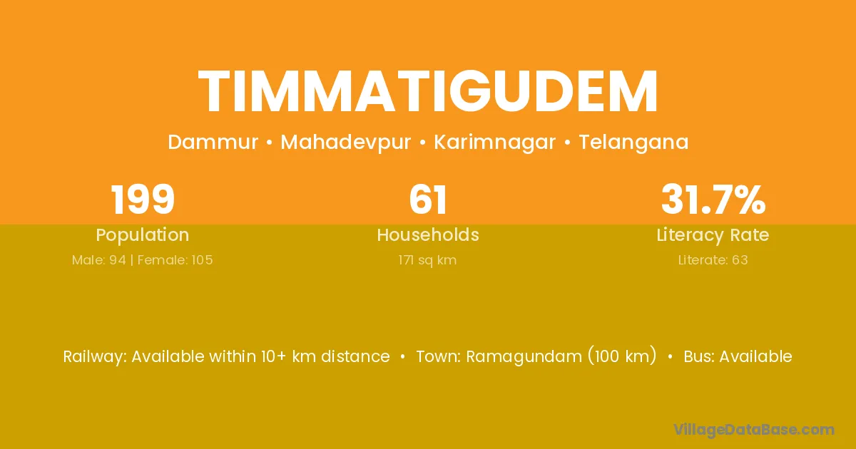 Ramagundam (100 km) is the nearest town to Timmatigudem village for major economic activities and is located approximately 100 km away.