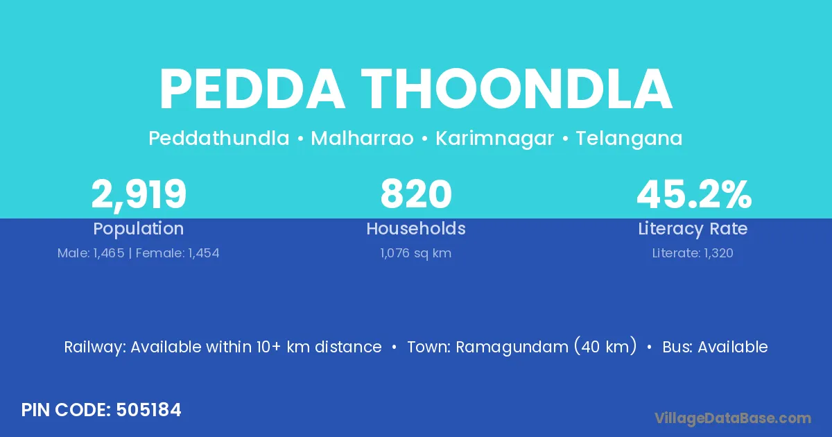 Ramagundam (40 km) is the nearest town to Pedda Thoondla village for major economic activities and is located approximately 40 km away.