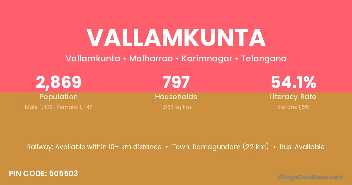 Vallamkunta village has a total population of 2,869 people, of which 1,422 are males and 1,447 are females.