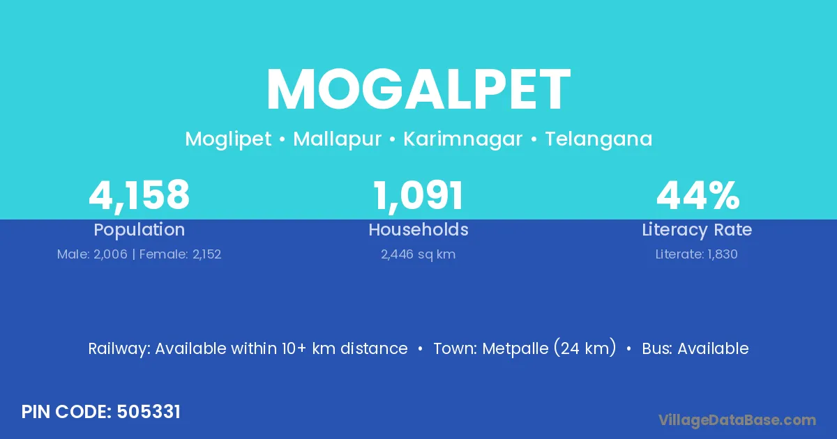 Metpalle (24 km) is the nearest town to Mogalpet village for major economic activities and is located approximately 24 km away.