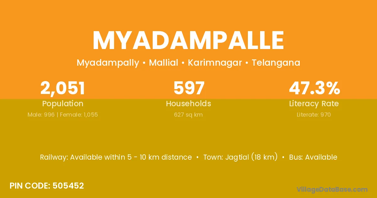 Jagtial (18 km) is the nearest town to Myadampalle village for major economic activities and is located approximately 18 km away.