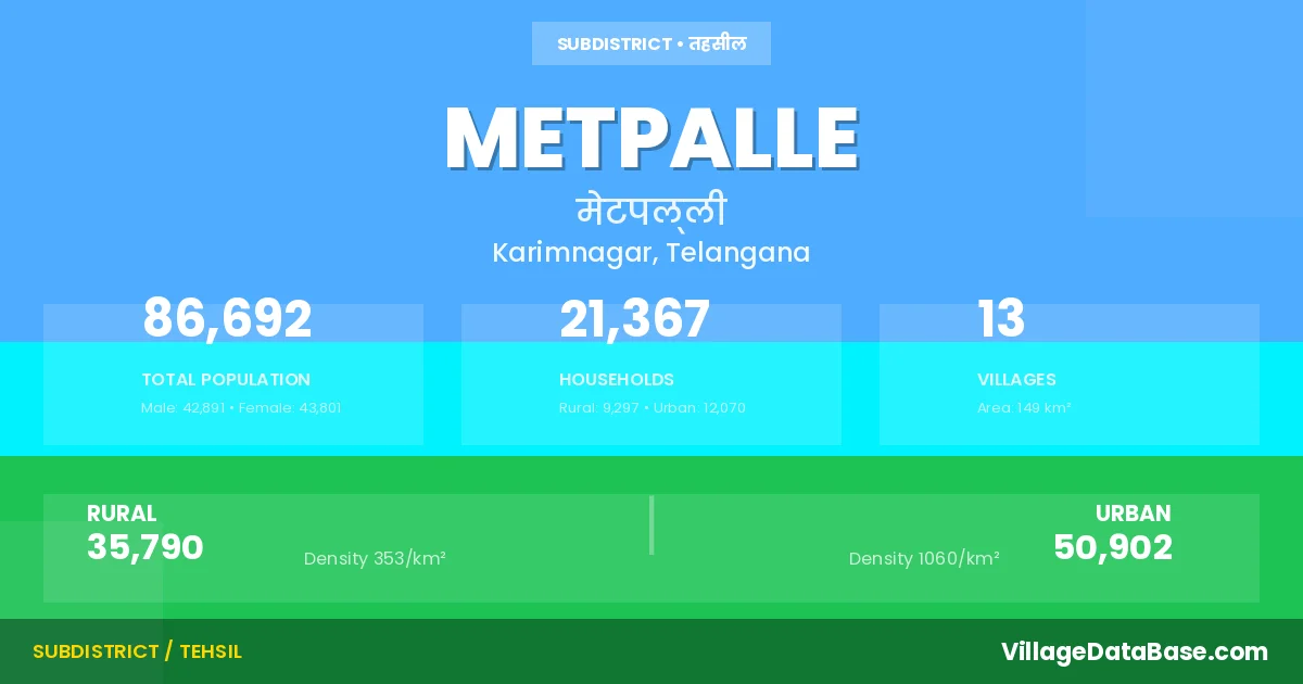 According to the 2011 census The total area of Metpalle Mandal is 149 km², with a population of 86692 people. The population density is 580 inhabitants per square kilometre, and there are approximately 21367 houses in the sub district.