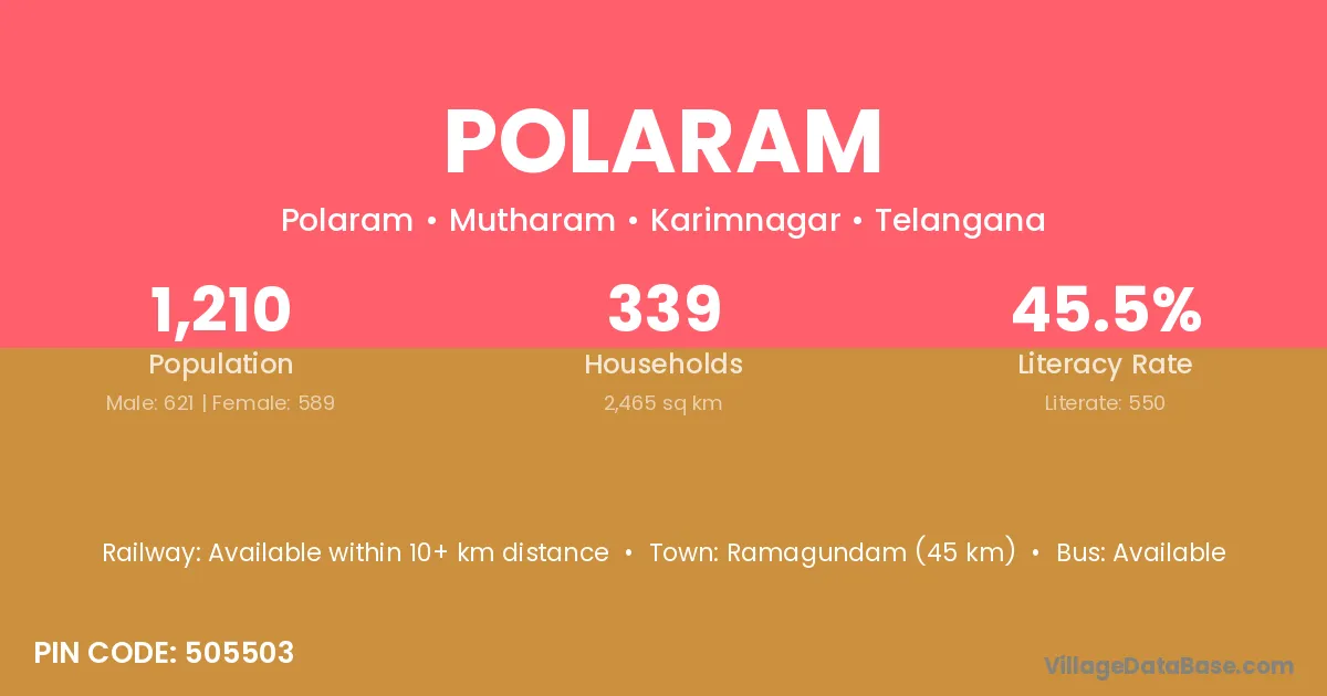Ramagundam (45 km) is the nearest town to Polaram village for major economic activities and is located approximately 45 km away.