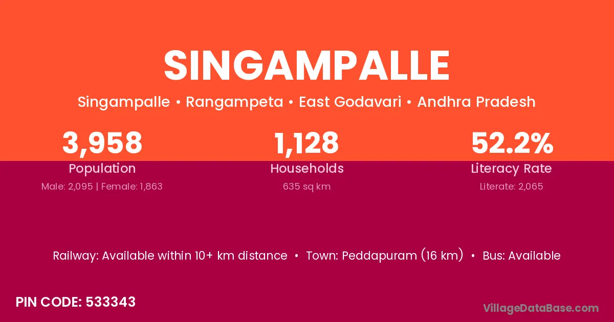 Ramagundam (57 km) is the nearest town to Singampalle village for major economic activities and is located approximately 57 km away.
