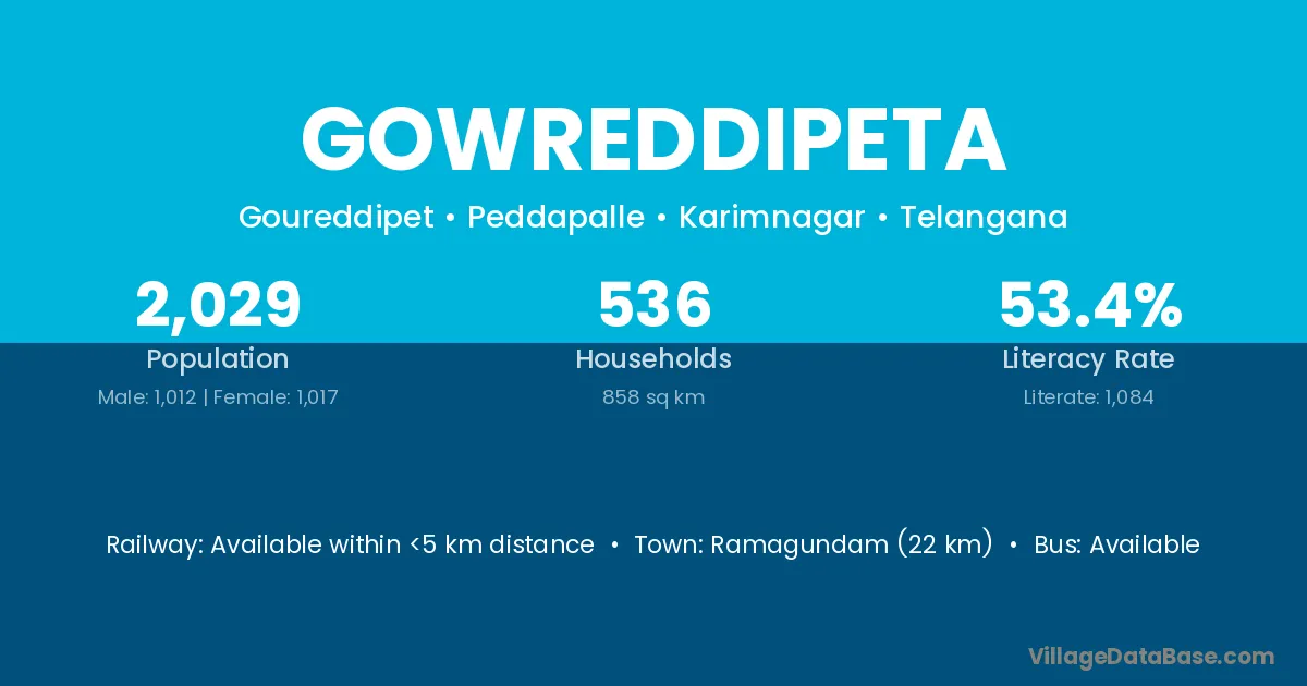 Ramagundam (22 km) is the nearest town to Gowreddipeta village for major economic activities and is located approximately 22 km away.