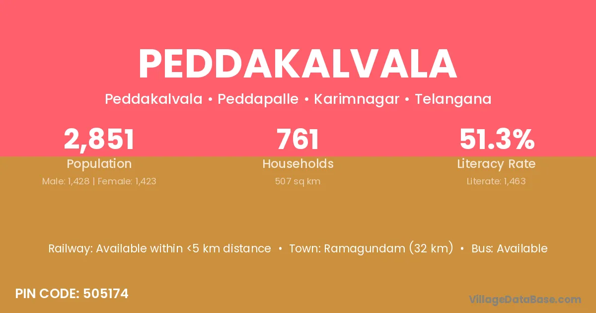 Ramagundam (32 km) is the nearest town to Peddakalvala village for major economic activities and is located approximately 32 km away.