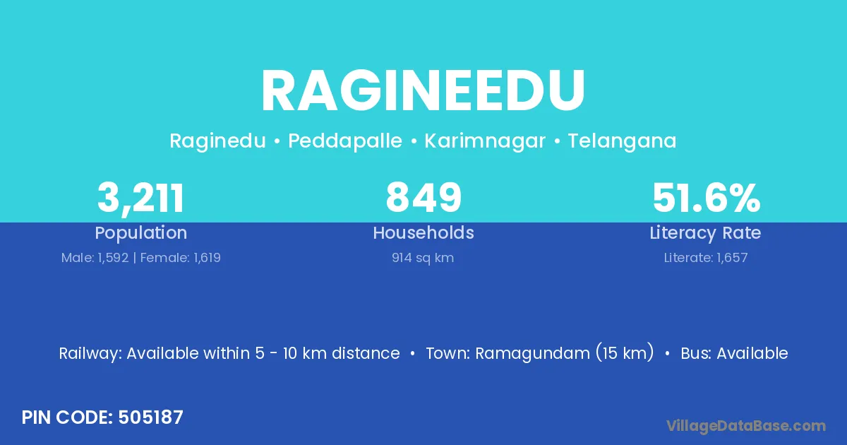 Ramagundam (15 km) is the nearest town to Ragineedu village for major economic activities and is located approximately 15 km away.