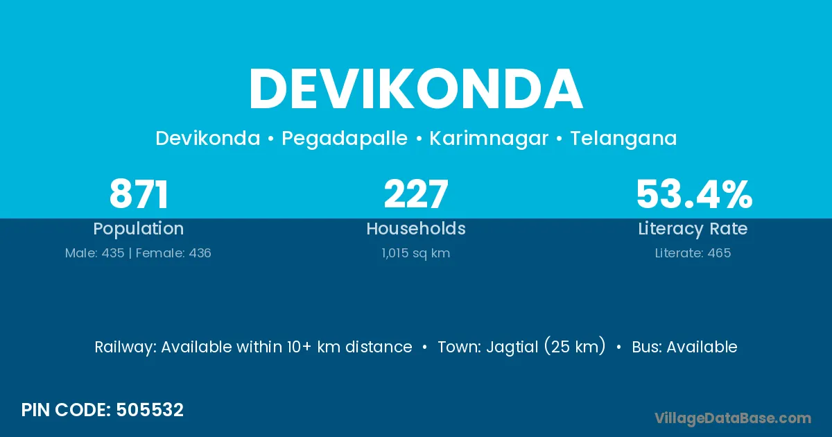 Jagtial (25 km) is the nearest town to Devikonda village for major economic activities and is located approximately 25 km away.