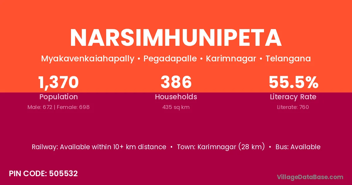 Karimnagar (28 km) is the nearest town to Narsimhunipeta village for major economic activities and is located approximately 28 km away.