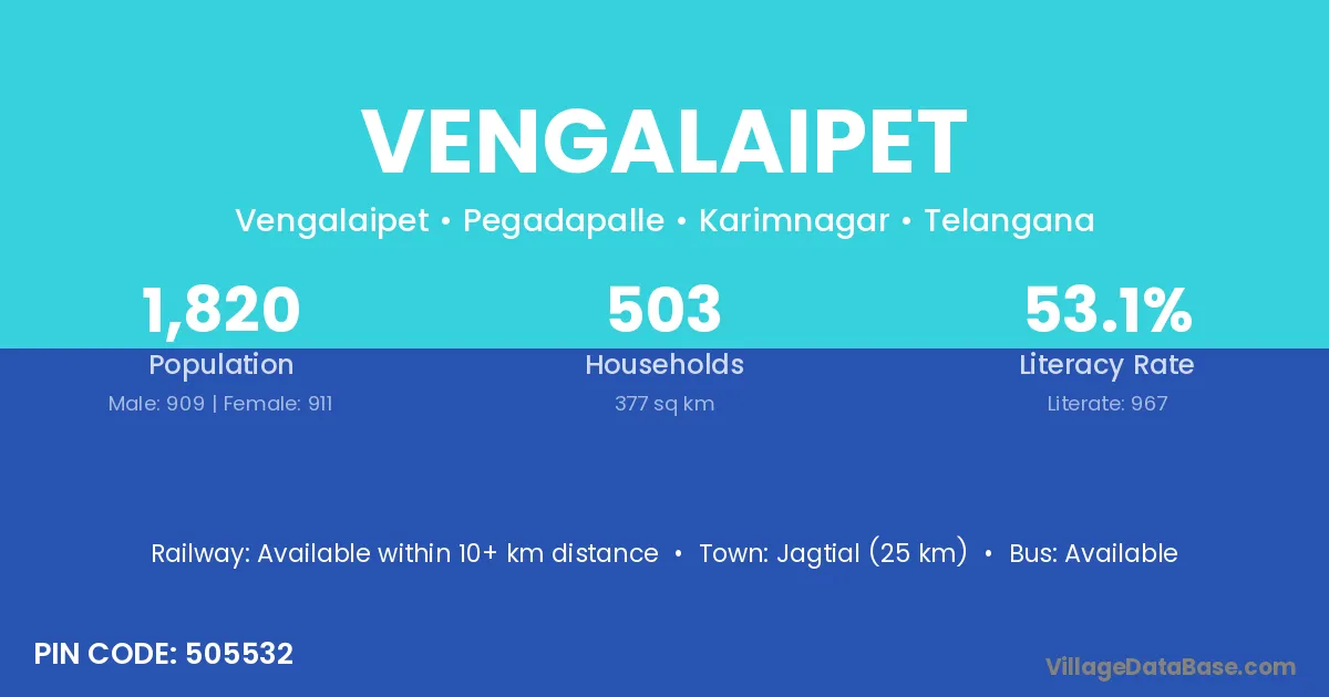 Jagtial (25 km) is the nearest town to Vengalaipet village for major economic activities and is located approximately 25 km away.