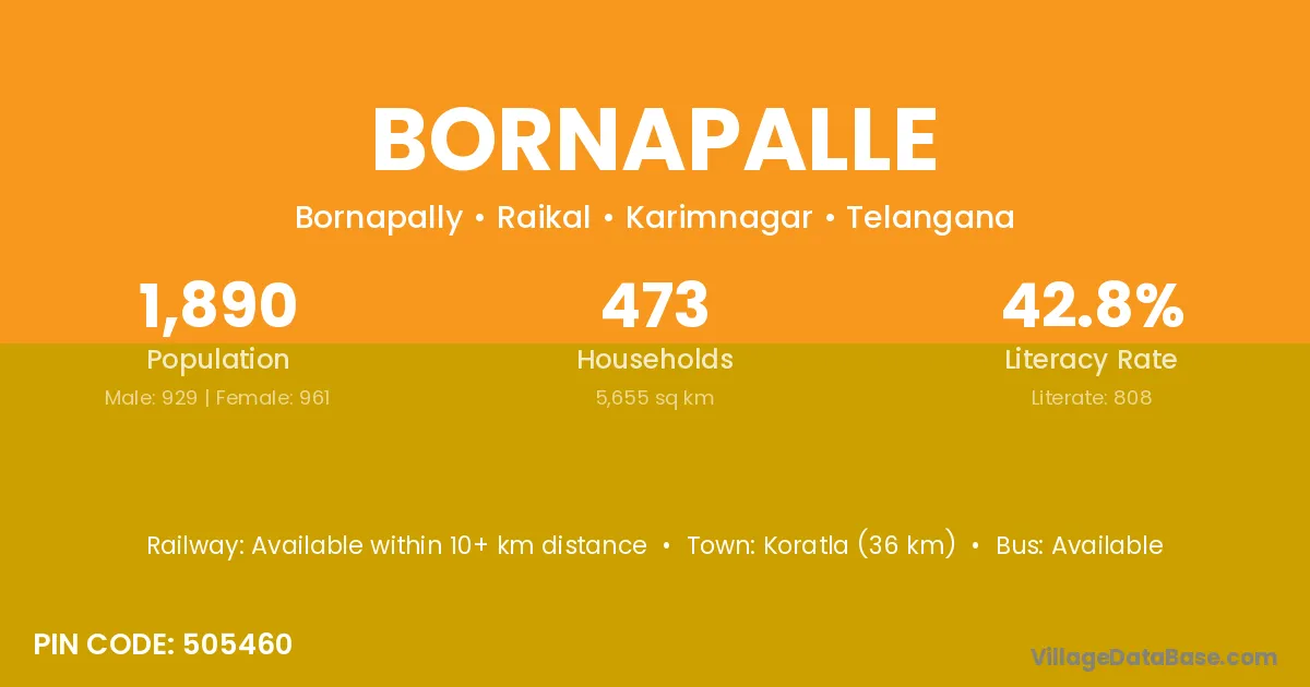 Koratla (36 km) is the nearest town to Bornapalle village for major economic activities and is located approximately 36 km away.
