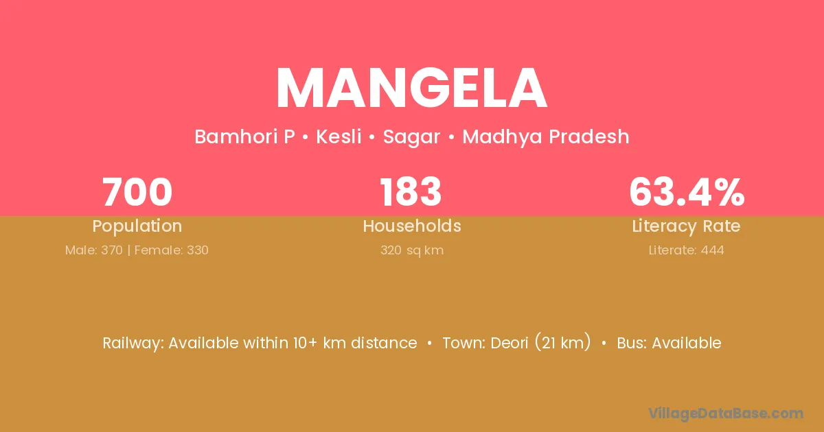 The literacy rate of Mangela village is 46.54%. Male literacy stands at 56.34% and female literacy at 37.63%.