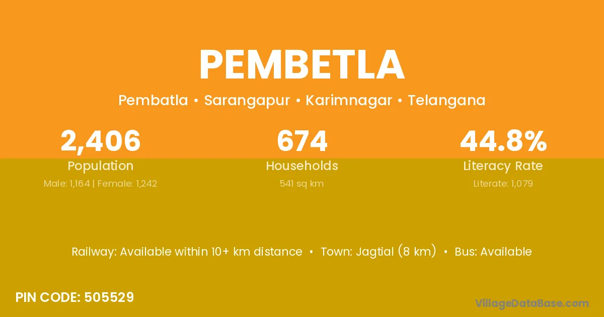 Jagtial (8 km) is the nearest town to Pembetla village for major economic activities and is located approximately 8 km away.