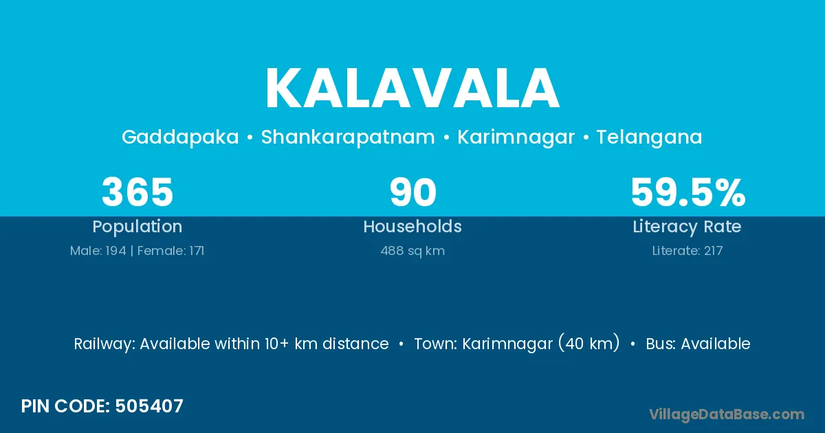 Karimnagar (40 km) is the nearest town to Kalavala village for major economic activities and is located approximately 40 km away.