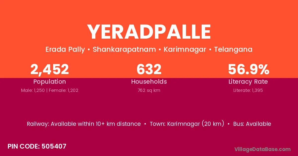 Karimnagar (20 km) is the nearest town to Yeradpalle village for major economic activities and is located approximately 20 km away.