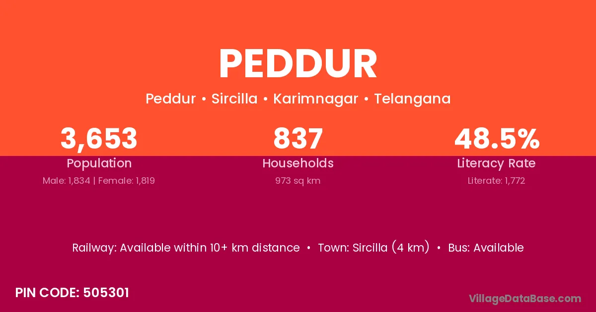 Sircilla (4 km) is the nearest town to Peddur village for major economic activities and is located approximately 4 km away.