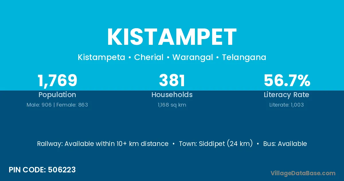 Karimnagar (60 km) is the nearest town to Kistampet village for major economic activities and is located approximately 60 km away.