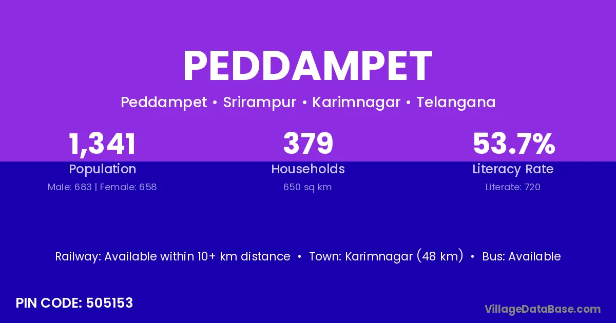 Karimnagar (48 km) is the nearest town to Peddampet village for major economic activities and is located approximately 48 km away.
