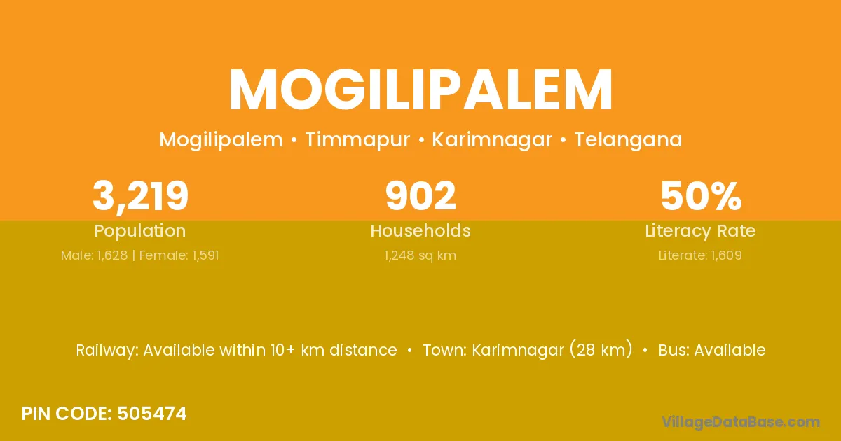 Karimnagar (28 km) is the nearest town to Mogilipalem village for major economic activities and is located approximately 28 km away.