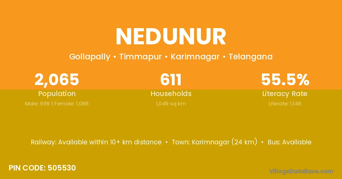 Karimnagar (24 km) is the nearest town to Nedunur village for major economic activities and is located approximately 24 km away.