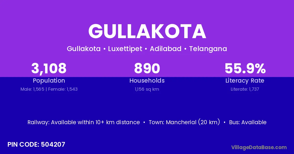 Ramagundam (41 km) is the nearest town to Gullakota village for major economic activities and is located approximately 41 km away.